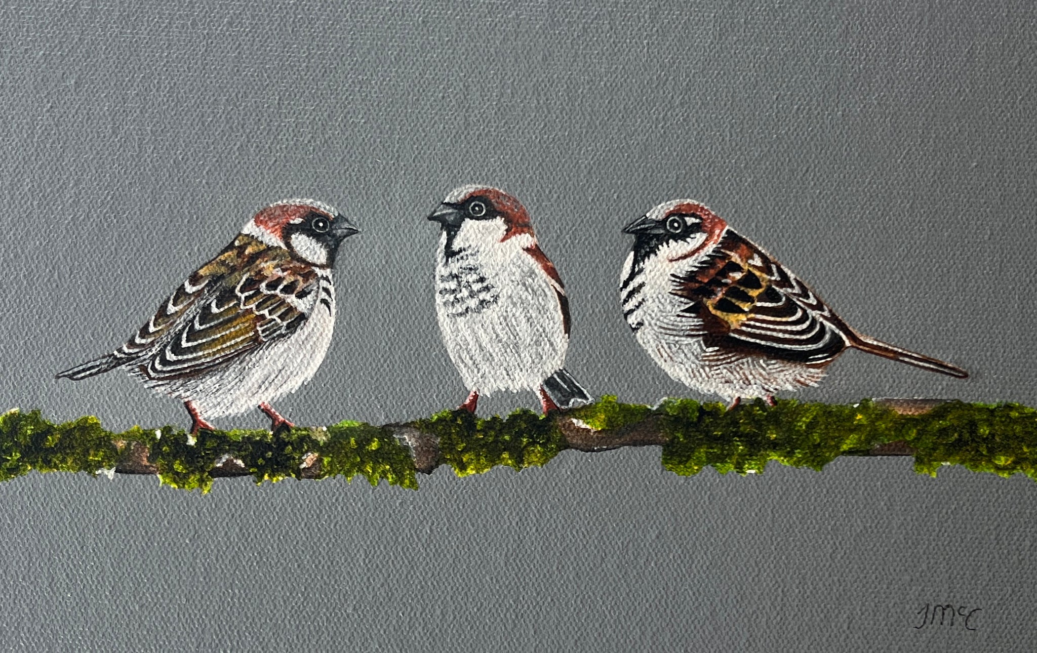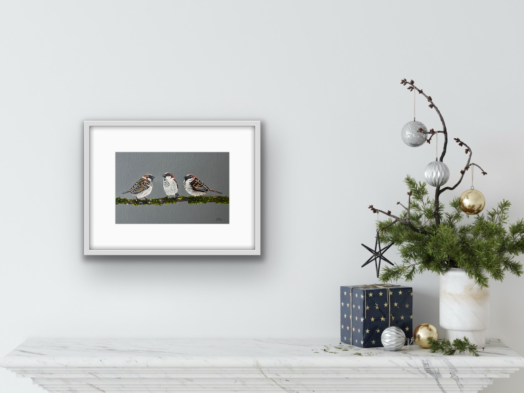Three lively sparrows caught mid-motion as if frozen in a playful chase. Their feathers are rendered in warm, textured brushstrokes that contrast with the soft, muted background.